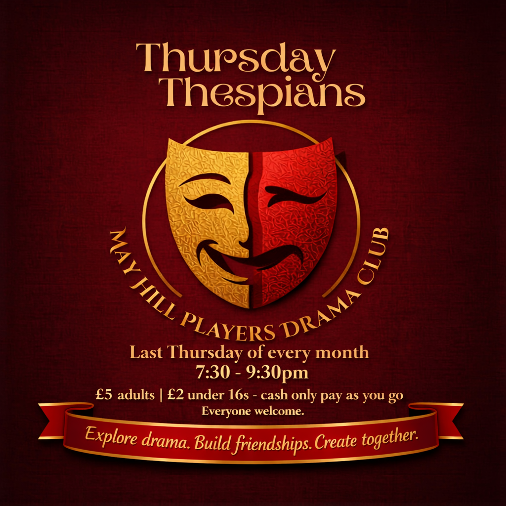 After the dizzy heights of our Panto, ‘Rapunzel’, we thought we’d quite like to start a Drama Club, to keep everyone ticking over between productions! After all, you bond as a group when you are performing and then it all sort of, well, stops. Thus was born the idea for ‘Thursday Thespians’. A monthly club, starting on Thursday 30th April 2026 at May Hill Village Hall 7:30-9:30pm. It’s £5 for adults and £2 for under 16s to be paid in cash only, on the night. We won’t be giving change, so please bring the correct money.